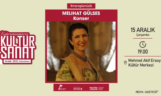 Kahramanmaraş Büyükşehir Belediyesi tarafından düzenlenen Aralık Kültür Sanat Etkinlikleri, birbirinden ünlü isimleri sanatseverlerle buluşturmaya devam ediyor. Takvim kapsamında, Klasik Türk Müziği’nin unutulmaz ismi Melihat Gülses ile konser programı düzenlenecek. 15 Aralık Çarşamba günü (bugün) saat 19.00’da Mehmet Akif Ersoy Kültür Merkezi’nde gerçekleştirilecek konserde, “Çok Aşığın Var Diyorlar”, “Kapın Her Çalındıkça”, “Göçmen Kızı” gibi eşsiz eserler kulakların pasını silecek. Kültür Spor ve Turizm Dairesi Başkanlığı’ndan yapılan açıklamada, ücretsiz etkinliğe tüm vatandaşların davet edildiği bildirildi.