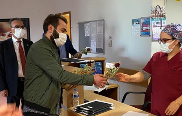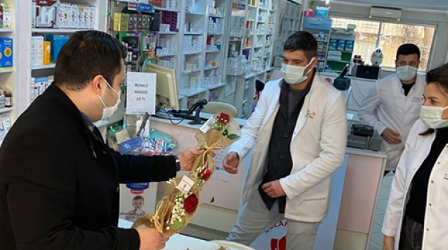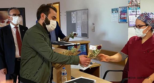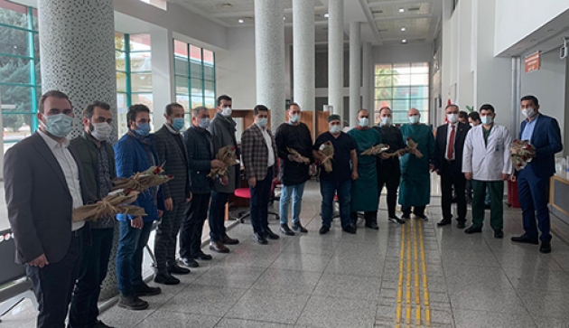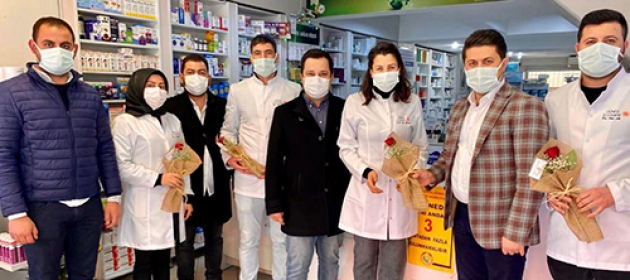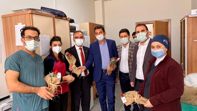 Necip Fazıl Şehir Hastanesi ve kentteki nöbetçi eczaneleri gezen partililer, özverili çalışmalarından dolayı sağlıkçılara teşekkür ederek çiçek verdi.