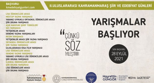 Kahramanmaraş Büyükşehir Belediyesi tarafından düzenlenecek “2. Uluslararası Şiir ve Edebiyat Günleri” yarışmaları kapsamında iki önemli değişikliği duyuruldu. Kısa film, müzik, resim, şiir okuma ve yazma, deneme ve mektup başta olmak üzere toplamda 14 alanda yapılacak yarışmaların başvuru süresinde süre uzadı. Yoğun talep dolayısıyla yapılan değişiklikle birlikte çevrimiçi olarak gerçekleştirilen başvurularda son tarih 28 Eylül Salı günü olarak açıklandı. Adaylar son başvuru tarihine kadar www.kmedebiyatgunleri.com adresi üzerinden form doldurarak yarışmalara katılabilecek.Ses Yarışmasında DeğişiklikEtkinlikler kapsamında düzenlenecek Âşık Mahzuni Şerif Türküleri Ses Yarışması’nda da kural değişikliğine gidildi. Bu kapsamda, yarışma kuralları arasında yer alan “Enstrüman çalma zorunluluğu” kaldırılmış oldu. Yapılan değişiklikle birlikte yarışmacılar, ilgili yarışmaya müzik aleti kullanmaksızın da katılabilecekler.