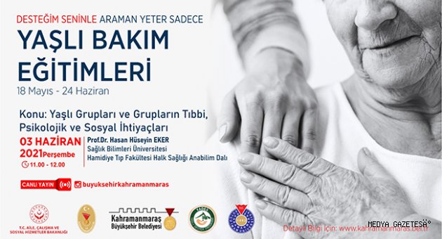 Kahramanmaraş Büyükşehir Belediyesi’nin katkılarıyla düzenlenen ‘Yaşlı Bakım Eğitimleri’ semineri 3 Haziran Perşembe günü (yarın) Prof. Dr. Hasan Hüseyin Eker’in konuk olacağı çevrimiçi programla devam edecek.
