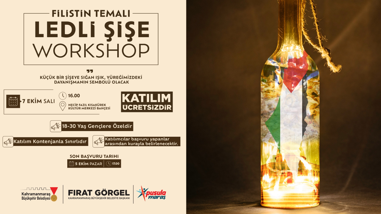 Kahramanmaraş Büyükşehir Belediyesi, gençlere yönelik anlamlı faaliyetlerini Pusula Maraş çatısı altında sürdürürken, Filistin’de yaşanan zulme dikkat çekmek ve farkındalık oluşturmak amacıyla özel bir etkinliği daha hayata geçiriyor. Gençlik Hizmetleri Şube Müdürlüğü koordinesinde 7 Ekim Salı günü Necip Fazıl Kısakürek Kültür Merkezi bahçesinde düzenlenecek atölyede, “Filistin Temalı Ledli Şişe” çalışması gerçekleştirilecek. 18 – 30 yaş aralığındaki gençlerin katılım sağlayabileceği etkinlikte, küçük bir şişeye yerleştirilecek ışıkla hem dayanışmanın sembolü olunacak hem de Filistin halkına destek mesajı verilecek. Etkinliğe katılmak isteyen gençler, https://kahramanmaras.bel.tr/duyuru/2025/10/01/filistin-temali-ledli-sise-workshop-basvuru-formu internet adresindeki başvuru formunu doldurarak kayıt yaptırabilecek. Son başvuru tarihi 5 Ekim Pazar.