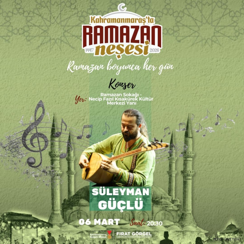 Kahramanmaraş Büyükşehir Belediyesi, Ramazan ayının manevi iklimini şehrin dört bir yanında hissettirmeye devam ederken, kültür ve sanat etkinliklerini de hız kesmeden sürdürüyor. Bu kapsamda Ramazan Sokağı’nda gerçekleştirilecek konserde katılımcılara unutulmaz bir akşam yaşatılacak. 6 Mart Cuma günü saat 20.30’da başlayacak programda, şehrin sevilen seslerinden Süleyman Güçlü, Türk Halk Müziği ziyafeti sunacak. Süleyman Güçlü, Anadolu’nun farklı yörelerinden Türk halk müziğinin en sevilen parçalarını müzikseverler için seslendirecek. Büyükşehir Belediyesinden yapılan açıklamada, etkinliğe tüm vatandaşların davetli bulunduğu belirtildi.