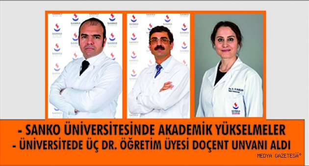 Üniversitelerarası Kurul Başkanlığı’nın onay yazısı ile SANKO Üniversitesi Tıp Fakültesi Kardiyoloji Anabilim Dalından Dr. Öğr. Üyesi Alper Serçelik, Kardiyoloji alanında, Tıbbi Farmakoloji Anabilim Dalından Dr. Öğr. Üyesi Necla Benlier, Tıbbi Farmakoloji alanında Sağlık Bilimleri Fakültesi Fizyoterapi ve Rehabilitasyon Bölümünden Dr. Öğr. Üyesi Gökhan Bülent Sever ise Ortopedi ve Travmatoloji alanında “Doçent” unvanı almaya hak kazandı.Doç. Dr. Alper Serçelik Kardiyoloji Uzmanı, Doç. Dr. Gökhan Bülent Sever ise Ortopedi ve Travmatoloji Uzmanı olarak akademik görevlerinin yanı sıra, SANKO Üniversitesi Hastanesi’nde hasta kabul ediyorlar.