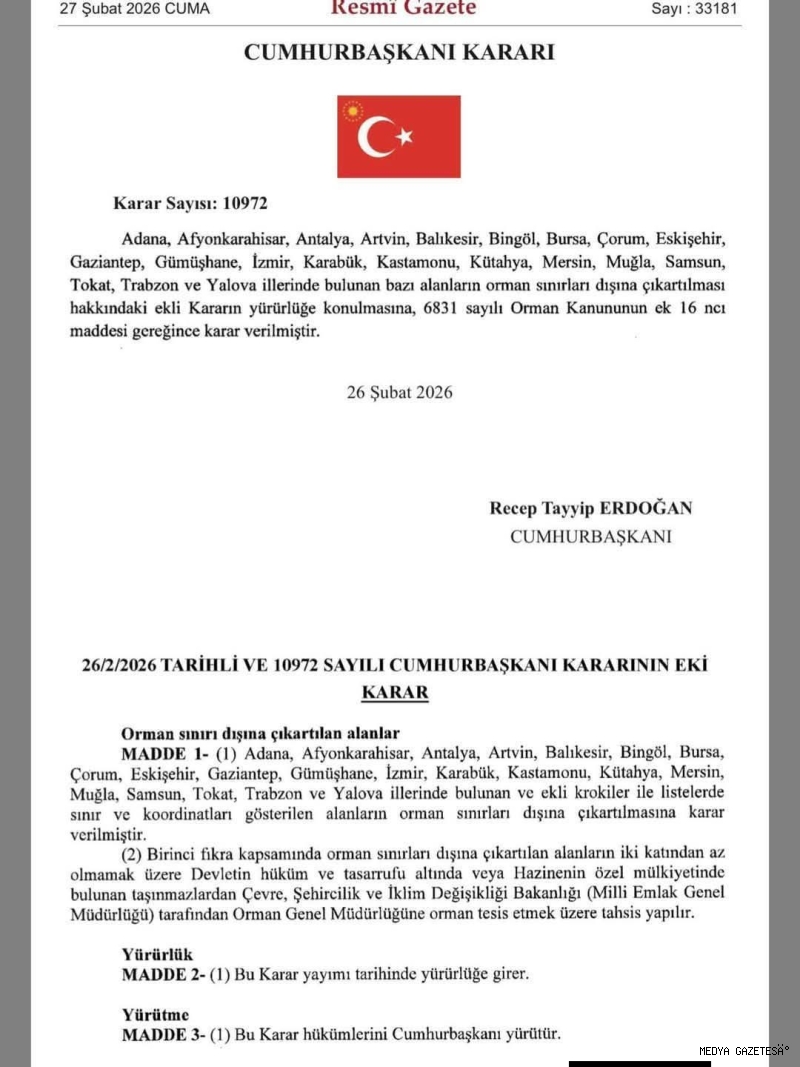 Yeniden Refah Partisi Elbistan İlçe Başkanı Sebahattin Kayabaşı, farklı illerde bazı alanların orman sınırları dışına çıkarılmasına yönelik kararın kamuoyunda ciddi soru işaretleri oluşturduğunu ifade etti.