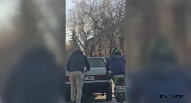 Şeyhadil Caddesi'nde yoldan geçen kişi tarafından kaydedilen görüntülerde arızalanan 46 F 4037 plakalı otomobilin bir şahıs tarafından itilmesi yer alıyor.Kayıtların devamında seyir halindeki motosikletin sürücüsünün de ayağıyla otomobili iterek bu kişiye yardımcı olmaya çalıştığı görülüyor.