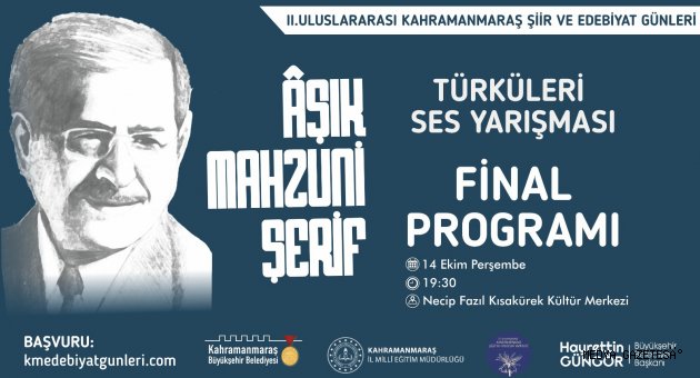 Büyükşehir Belediyesi 2. Uluslararası Kahramanmaraş Şiir ve Edebiyat Günleri kapsamında düzenlenen Âşık Mahzuni Şerif Türküleri Ses Yarışması final programı 14 Ekim Perşembe günü NFK Kültür Merkezi’nde gerçekleştirilecek.