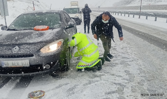 Kahramanmaraş’ta kar yağışı nedeniyle yolda kalan, ilerlemekte güçlük çeken sürücülerin yardımına jandarma ekipleri koştu.