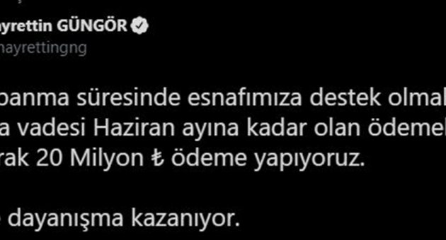 Pandemi sürecinde esnafa verilen desteklere bir yenisinin daha eklendiğini açıklayan Büyükşehir Belediye Başkanı Hayrettin Güngör, “Tam kapanmanın yaşanacağı 17 günlük süre zarfında esnafımıza destek olabilmek ve rahat bir bayram geçirmelerini sağlamak için inşallah ödemeleri erkenden yapıyoruz. Haziran ayına kadar vadesi olan yaklaşık 20 Milyon TL ödememizi gerçekleştireceğiz. Bu günleri birlikte aşacağız. Esnafımıza hayırlı uğurlu olsun” dedi.Kahramanmaraş Büyükşehir Belediye Başkanı Hayrettin Güngör, tam kapanma sürecine yönelik yeni bir çalışmayı daha açıkladı. Başkan Güngör, birlik ve dayanışma kazanır ifadelerini kullandığı açıklamasında, “Biz Büyükşehir Belediyesi olarak alışverişlerimizi esnaflarımızdan yapmaya gayret gösterdik. Bununla birlikte finansal bir güven oluşturduk. Tam kapanmanın yaşanacağı 17 günlük süre zarfında esnafımıza destek olabilmek ve rahat bir bayram geçirmelerini sağlamak için inşallah ödemeleri erkenden yapıyoruz. Haziran ayına kadar vadesi olan yaklaşık 20 Milyon TL ödememizi gerçekleştireceğiz. Bu günleri birlikte aşacağız. Esnafımıza hayırlı uğurlu olsun” ifadelerini kullandı. Büyükşehir Pandemi DestekleriKahramanmaraş Büyükşehir Belediyesi, pandemi döneminde hayata geçirdiği sosyal destek ve çalışmalarla örnek oldu. Tam kapanma sürecinde 30 bin ihtiyaç sahibine pos cihazı olan tüm işyerlerinde geçerli, 250 TL bakiyeli alışveriş kartı dağıtıldı. Ardından Büyükşehir Belediye Başkanı Hayrettin Güngör, yine tam kapanma sürecinde ihtiyaç sahibi vatandaşlara ücretsiz ekmek verileceğini açıklamıştı. Esnafa yönelik yeni bir adım daha atan Başkan Güngör, bayram öncesi tam kapanmada esnafa destek olma amacıyla 20 Milyon TL’lik ödemenin vadesinde önce yapılacağını duyurdu. Video Link: https://we.tl/t-WzU2qRKYjr
