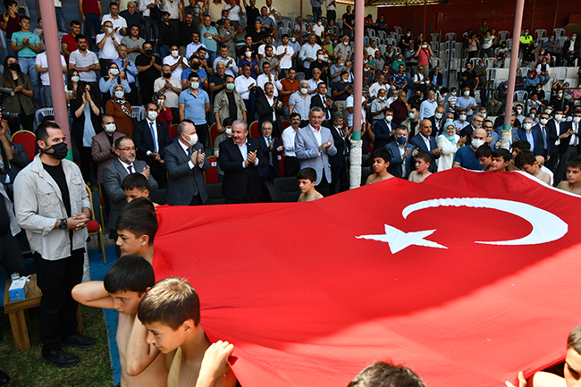 Şentop, bu meydanda çok yiğidin peşrev çektiğini, güreş tuttuğunu belirterek şöyle devam etti:"Birbirinden merdane yiğitlerimiz bugün de yiğitliklerini, mertliklerini gösterdiler. Bu meydanlarda yetişen Ahmet Ak, Metin Kaplan, Hayri Yücel, Harun Doğan, Adem Kaya, Fevzi Kaynak, Yalçın Özdemir, Muhsin Nergiz, Mustafa Özdemir, Nuri Temur, Onur Atalay, Mevlüt Özdemir, Remzi Temur, Süleyman Konak, Serdar Böke, Üzeyir Ekici bizlere dünya ve Avrupa şampiyonluğunun heyecanını, mutluluğunu ve gururunu yaşattılar. 'Alta düştüm' diye yerinmeyen, 'Üste çıktım' diye sevinmeyen pehlivanlarımızın hepsi takdiri, tebriki hak ettiler. Er meydanına yaraşır şekilde rakibini yenmeye çalışan yiğitlerimiz sadece güçlerini, kuvvetlerini sergilemediler. Aynı zamanda mertliğe, dürüstlüğe, iyiliğe dair insani hasletlerini de gösterdiler. Hepsini ayrı ayrı kutluyorum."