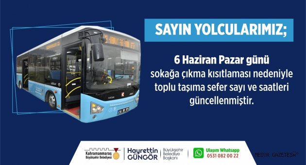 Kahramanmaraş Büyükşehir Belediyesi tarafından 6 Haziran Pazar günü sokağa çıkma kısıtlaması nedeniyle toplu taşıma sefer sayı ve saatlerinde güncelleme yapıldı.