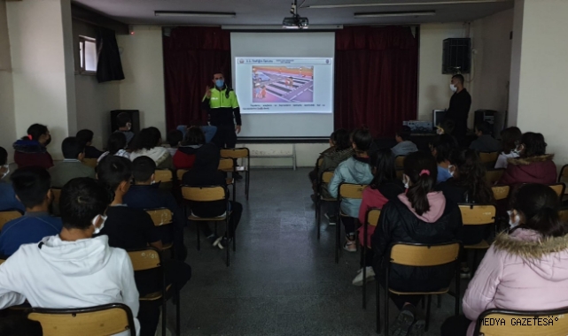 Pazarcık İlçe Emniyet Müdürlüğü Trafik Denetleme Büro Amirliği, 2021-2023 karayolu trafik güvenliği eylem planı kapsamında öğrencilere yönelik, trafik güvenliği, trafikte farkındalık, trafikte saygı ve nezaket kuralları, trafik bilinci ve genel trafik kuralları hakkında bilgi verdi.