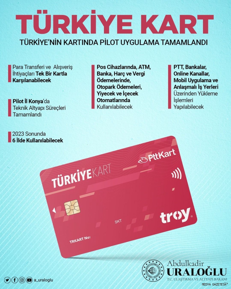 - 'TÜRKİYE KART' UYGULAMASINI 81 İL’DE YAYGINLAŞTIRMAYI HEDEFLİYORUZ- 'TÜRKİYE KART' İLE ULAŞIM, PARA TRANSFERİ VE ALIŞVERİŞ İHTİYAÇLARI TEK BİR KARTLA KARŞILANABİLECEK - 'TÜRKİYE KART' VATANDAŞLARIMIZIN ULAŞIM VE ÖDEME İŞLEMLERİNİ KOLAYLAŞTIRACAK Ulaştırma ve Altyapı Bakanı Abdulkadir Uraloğlu, Türkiye Kart projesinin pilot uygulamasının Konya’da tamamlandığını, 81 ilde yaygın hale getirilmesi için çalışmaların sürdüğünü kaydederek, “İlk adımı Konya’da attık. Kayseri, Yozgat ve Gümüşhane’de, belediyeler ile sözleşme süreçleri de tamamlandı.” dedi.Ulaştırma ve Altyapı Bakanı Abdulkadir Uraloğlu, Türkiye Kart ile ilgili değerlendirmelerde bulundu. Tüm ulaşım hizmetlerinden ve finansal sistemden faydalanma imkânı sunan Türkiye Kart ile ilgili olarak “Proje kapsamında amacımız, şehir içi toplu taşıma hizmetlerinin sunulduğu ulaşım sektöründeki tüm paydaşların dahil olacağı bir takas, switch, mahsuplaşma ve operasyon merkezinin kurulması ile Türkiye Kart’ı her alanda devreye sokmak. Türkiye Kart’ın ulaşım araçları, para transferleri, alış-veriş ve birçok ihtiyaçlarda tek kart olarak kullanılabilmesini sağlamak.” diye konuştu.ENTEGRASYON SÜRECİ TAMAMLANDIBakan Uraloğlu, “Konya’da teknik altyapı süreçleri tamamlandı. İstanbul'da yeni havalimanı metro hattı entegrasyonu da hazır. Kayseri Büyükşehir, Yozgat ve Gümüşhane Belediyeleri ile sözleşme süreci bitti. Cumhurbaşkanlığı Yıllık Programı doğrultusunda 2023 yılı sonuna kadar hedefimiz 6 ilde projeyi devreye sokmak. TCDD ve TCDD Taşımacılık tarafından işletilen tüm raylı sistemlerde Türkiye Kart'ın devreye alınmasına yönelik çatı sözleşme süreçleri de devam ediyor. GAZİRAY, BAŞKENTRAY ve İZBAN hatlarında sözleşme sonrası entegrasyon süreçleri başlatılacak. İlerleyen süreçte diğer belediyeler ve operatörler, sisteme dahil edilerek, projenin yaygınlaştırılmasını hedefliyoruz. Türkiye Kart Projesi ulaşım sektörüne önemli bir dönüşüm getirecek. Vatandaşlarımız daha kolay, hızlı ve etkili bir şekilde ulaşım ve ödeme işlemlerini gerçekleştirebilecek” diye konuştu.TÜRKİYE KART’IN ÖZELLİKLERİYıl sonunda 6 ilde kullanılmaya başlanacak olan Türkiye Kart, toplu ulaşım ile birlikte POS ve ATM cihazlarında, belediye harçları ve vergi ödemeleri, otopark ödemeleri, anlaşmalı iş yerleri, taksi ödemeleri, yiyecek ve içecek otomatlarında kullanılabilecek. Ayrıca, PTT kanalları, bankalar ve devlet kurumları, online kanallar, mobil uygulama ve anlaşmalı iş yerleri üzerinden yükleme işlemleri de yapılabilecek.