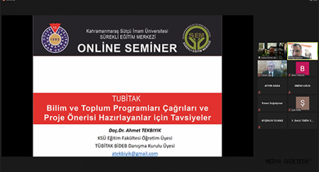 Zoom uygulaması üzerinden çevrim içi olarak gerçekleştirilen seminerin açılış konuşmasını üniversitemiz Rektörü Prof. Dr. Niyazi Can yaptı.“KSÜ olarak bilimsel araştırma alanlarında akademisyenlerimizin dünya çapındaki öncül çalışmaları ile üniversitemizin lider kimliğinin proje alanlarında da yer alması adına üniversite bünyesinde oluşturduğumuz; Bilimsel Araştırma Projeleri Koordinasyon Birimi, Proje Geliştirme, Koordinasyon Uygulama ve Araştırma Merkezi ve Avrupa Birliği Araştırma ve Uygulama Merkezi (KSÜ-ABAUM) işbirliği ile üniversitemizdeki akademik personelimizin proje geliştirmesi için çalışmaktayız.” diyen ve bu manada TÜBİTAK projelerinin önemini vurgulayan Prof. Dr. Niyazi Can, üniversitemiz Sürekli Eğitim Merkezinin düzenlediği bu seminerin üniversitemizin TÜBİTAK bilim toplum çağrılarındaki başvuru sayısının artması noktasında teşvik edici olacağına inandığını söyledi.Üniversitelerin eğitim, bilim ve teknolojide toplumlara öncülük etmek gibi önemli bir misyonunun olduğunu belirten Rektör Can, şehir ve ülke sorunlarına çözüm önerileri getirmeyi amaçlayan proje süreçlerinin ilerlemesinde araştırmacılara önemli tavsiyeleri içeren seminerin hazırlanmasında emeği geçen herkese teşekkür etti.Açılış konuşmasının ardından Türkiye Bilimsel ve Teknolojik Araştırma Kurumu (TÜBİTAK) Bilim İnsanı Destekleme Daire Başkanlığı Danışma Kurulu Üyesi, KSÜ Sürekli Eğitim Merkezi Müdürü, Eğitim Fakültesi Öğretim Üyesi Doç. Dr. Ahmet Tekbıyık, ‘TÜBİTAK Bilim ve Toplum Programları Çağrıları ve Proje Önerisi Hazırlayanlar için Tavsiyeler’ konulu seminer sunumunu gerçekleştirdi.Doç. Dr. Ahmet Tekbıyık, seminer sonrasında akademisyenlerin proje hazırlıklarında dikkat edilmesi gereken hususlara ilişkin sorularını cevaplandırdı.