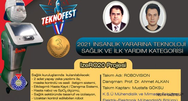 Kahramanmaraş Sütçü İmam Üniversitesi (KSÜ) Mühendislik ve Mimarlık Fakültesi Elektrik-Elektronik Mühendisliği Bölümü Elektronik Anabilim Dalı Başkanı Prof. Dr. Ahmet Alkan’ın danışmanlığını yaptığı, üniversitemiz öğrencisi Mustafa Göksu’nun kaptanlığını yürüttüğü ‘RoboVision’ isimli takım, TEKNOFEST Havacılık, Uzay ve Teknoloji Festivali 2021 İnsanlık Yararına Teknoloji Yarışması Sağlık ve İlkyardım kategorisinde ‘IzeRO20’ isimli projeyle 3.’lük elde etti.IzeRO20 isimli yapay zekâ destekli robot, Covid-19 sürecinde etkileşimli hasta kayıt, maske kontrolü, hasta nabız ve SpO2 ölçümü gibi işlemleri yapabilen, sağlık sektöründe izolasyon ve tasarruf sağlayabilecek özelliklere sahiptir.TEKNOFEST Havacılık, Uzay ve Teknoloji Festivali 2021 İnsanlık Yararına Teknoloji Yarışması Sağlık ve İlkyardım kategorisinde 3. olan ‘RoboVision’ takımını tebrik eden üniversitemiz Rektörü Prof. Dr. Niyazi Can, “Üniversitemizde ülkemizin kalkınmasına katkı sağlayacak her türlü çabayı, projeyi, araştırmayı üniversitemiz imkânları ölçüsünde destekliyoruz. Ülkemizin aydınlık geleceği olan gençlerimizin fikir ve projelerini önemsiyor ve bütün olanaklarımızı onların istifadesine sunuyoruz.” ifadelerini kullandı.Yapay zekâ destekli, sağlık alanında işlevsel, otonom robot IzeRO20’yi hazırlayan ‘RoboVision’ takımını ve öğretim üyemizi tebrik eder, başarılarının devamını dileriz.