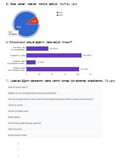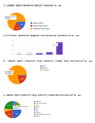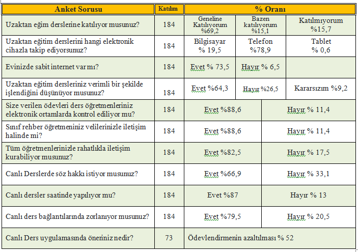 Öğrencilerin ankete verdiği cevaplara göre uzaktan eğitim yüz yüze eğitimi aratmamakta. Öğrencilerin genel olarak uzaktan eğimden memnun oldukları, derslere ağırlıklı olarak cep telefonuyla katılım sağladıkları tespit edildi. Ders öğretmenlerinin öğrencilerin ödevlerini yapıp yapmama konusunda sıkı takipte oldukları, öğrencilerin ders sırasında alınan ekran görüntülerini daha sonrasında düzenli bir not şeklinde istenmesinden şikayetçi oldukları anket sonuçlarına yansıdı.