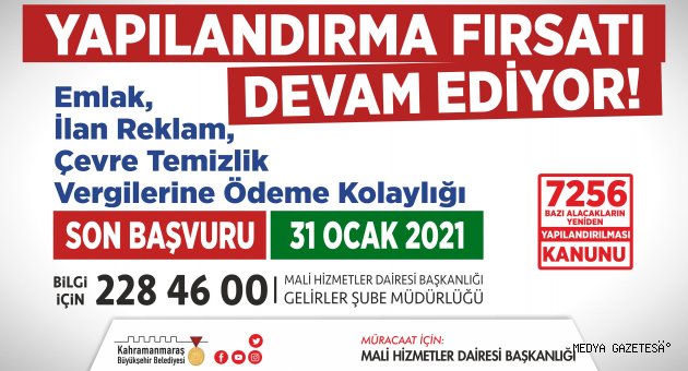 Kahramanmaraş Büyükşehir Belediyesi’nin ‘7256 Sayılı Bazı Alacakların Yeniden Yapılandırılması Kanunu’ kapsamında tüm vergi kalemlerinde başlattığı yapılandırma fırsatı vatandaşlardan gelen talep üzerine bir ay uzatıldı. Taksitli veya nakit ödeme seçeneğinin yer aldığı düzenlemede farklı vergi kalemlerindeki borçlara %90’a varan indirimler yapılıyor. Gelen yoğun talep üzerine uzatılan vergi yapılandırma fırsatında son gün 31 Ocak 2021 olarak belirlendi. Mali Hizmetler Dairesi Başkanlığı tarafından yapılan açıklamada, “Yapılandırma başvuruları 31 Ocak 2021 tarihine kadar devam edecek. Yapılandırmayla ilgili bilgi için vatandaşlarımız 0344 228 46 00 numaralı telefonu arayabilir” ifadeleri kullanıldı.