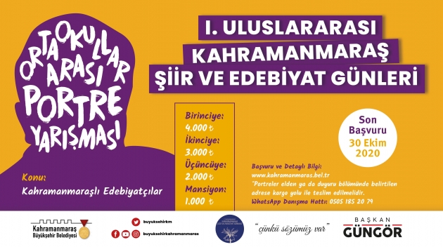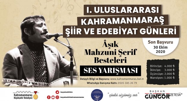 Kahramanmaraş Büyükşehir Belediyesi 1. Uluslararası Şiir ve Edebiyat Günleri kapsamında düzenlenen yarışmalarda başvurular devam ediyor. Şiir, öykü ve deneme yarışmalarından portre ve Aşık Mahzuni Şerif Besteleri ses yarışmasına kadar farklı kategorilerde ödüllü yarışmalar gerçekleştiriliyor. Son başvurunun 30 Ekim Cuma olduğu yarışmalar ile ilgili detaylar, Büyükşehir Belediyesi internet sitesi www.kahramanmaras.bel.tr üzerinden yayınlanıyor.Öykü, Şiir ve DenemeUluslararası etkinlik içerisinde, Yetişkinler ve Liseler arası olmak üzere iki farklı kategoride öykü, şiir ve deneme yarışmaları yer alıyor. Yetişkinler arası gerçekleştirilen yarışmaya ülke genelinde 18 yaş üstü tüm sanatseverler katılabiliyor. Liseler arası kategorisindeki yarışmaya ise ülke geneli lise ve dengi (resmî ve özel) okullarda öğrenim gören tüm öğrenciler başvurabiliyor. Gerek yetişkinler gerekse liseler arası gerçekleştirilecek şiir, öykü ve deneme yarışmalarında konu serbest olarak belirlendi.Aşık Mahzuni Şerif Besteleri Aşıklık geleneğinin tanınırlığını artırma ve bu geleneğin sürdürülmesini özendirme amaçlı düzenlenen yarışmaya 15 yaş üstü tüm sanat severler katılabiliyor. Son başvurunun 30 Ekim Cuma olduğu yarışmada halk ozanı Âşık Mahzuni Şerif’in eserlerinin bağlama eşliğinde seslendirilmesi gerekiyor. Türk Halk Müziği formuna uyulmasının istendiği yarışmada türkülerin süresi en fazla 5 dakika olarak belirlendi.Portre YarışmasıYarışmaya ülke genelindeki (resmi ve özel) ortaokullarda öğrenim gören bütün öğrenciler katılabiliyor. Kahramanmaraşlı bir şair veya yazarın resmi / portresi ile katılım sağlanabilecek yarışmada çalışmaların ölçüsü 35 x 50 cm olarak belirlenmiştir. Resimler, yarışmacı katılım formu ile elden ya da posta yoluyla Kahramanmaraş Büyükşehir Belediyesi, Kültür, Spor ve Turizm Dairesi Başkanlığı, Kayabaşı Mah. Vakıftarla Cad. No: 6 Dulkadiroğlu / Kahramanmaraş adresine gönderilebilecek.