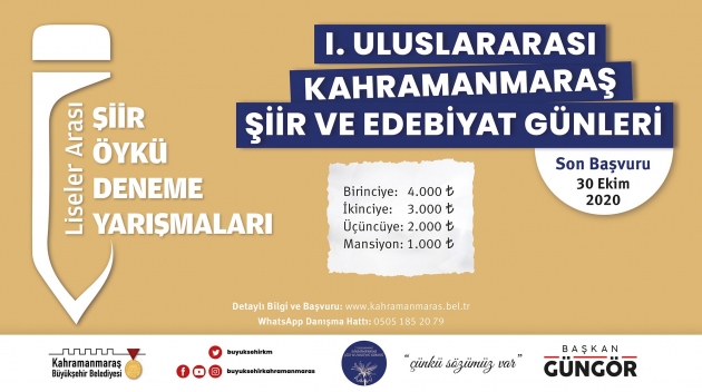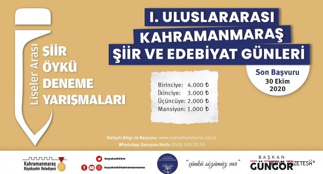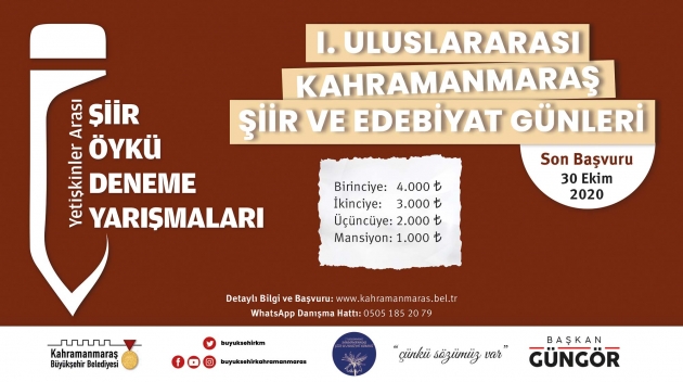 1.Uluslararası Kahramanmaraş Şiir ve Edebiyat Günleri kapsamında düzenlenen yarışmalarda son başvuru tarihi 30 Ekim Cuma.