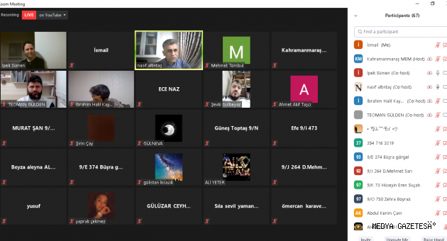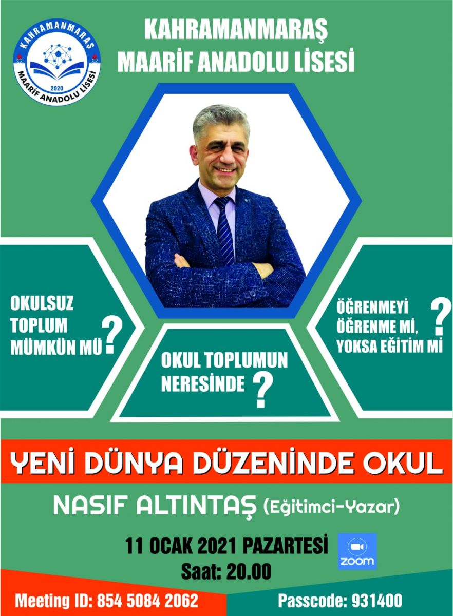 Program Türk Dili ve Edebiyat Öğretmeni Hüsne İpek SÜMEN'in moderatörlüğünde gerçekleşti. SÜMEN, kısaca Eğitimci-Yazar Nasıf ALTINTAŞ'ın özgeçmişinde bahsetti:“1978 de Adana’nın Kozan ilçesinde doğdu. İlkokul, ortaokul ve liseyi Kozan’da okudu. Fırat Üniversitesi Türk Dili ve Edebiyatı bölümünden 2002’de mezun oldu. Özel öğretim kurumlarında öğretmenlik ve yöneticilik yaptı. 2016 yılında Milli Eğitim Bakanlığı’na geçiş yaptı. Evli ve üç kız babası olan hocamızın ‘Yalnız Kartal Yavrusu’ isimli bir de kitabı bulunmaktadır.”Hüsne İpek SÜMEN, daha sonra sözü selamlama konuşması için Okul Müdürü İbrahim Halil KAYMAZ’a verdi. Kaymaz özetle:“Öncelikle bizleri kırmayıp programımıza icabet eden Nasıf Altıntaş hocamıza, kıymetli öğretmen arkadaşlarımıza, velilerimize ve öğrencilerimize teşekkür ediyoruz.Okulun insan hayatındaki yeri sürekli tartışılan bir mevzudur. Ancak pandemi sürecinde artık bu mevzuyu tartışmanın ötesinde yaşayarak anlamlandırıyoruz. Bizler öğrencilerimizi özledik. Artık yüz yüze bir araya gelmek istiyoruz. Okul sadece eğitim-öğretimin yapıldığı bir alan olmanın ötesinde bir yaşam alanı, tecrübe alanı, sosyalleşme alanıdır. Bu düşüncelerle, programımızın hayırlara vesile olmasını diliyor katılımcılara teşekkür ediyorum. Hoş geldiniz.”Program, okul müdürünün selamlama konuşmasının ardından edebiyat öğretmeni Hüsne İpek SÜMEN'in Nasıf ALTINTAŞ'a yönelttiği, “Okulsuz toplum mümkün müdür?” sorusuyla başladı.Nasıf Altıntaş, Yunan mitolojisindeki Prometheus ve Zeus hikayesini anlatarak konuya giriş yaptı. “Zeus bilgiyi temsil eden ateş ile dağlarda aydınlık içinde yaşarken, halk ovalarda karanlıkta yaşarmış. Prometheus bir plan yapar ve bu ateşi tanrılardan çalar. Bugünkü olimpiyat ateşi de aslında bu hikayedeki bilgiyi temsil eder. Maalesef uzaktan eğitim sürecinde internet, bu hikayedeki ateş gibi tanrılaştırıldı. Bilginin tek kaynağı gibi lanse edilmeye başlandı.”Sözlerine “salgın bizleri çevrim içine zorluyor” diyerek devam eden ALTINTAŞ, şöyle devam etti: “Okullar sadece bilgi aktaran mekanlar değildir. Biz öğretmenler de sadece bilgi aktaran varlıklar değiliz.”Bu sözler üzerine, Hüsne İpek SÜMEN, “öğrenci ile etkileşime girmeden ders anlatmak o kadar zor ki, anlattığın şeyin karşıda bir etkisinin olduğunu görmek paha biçilemez” dedi.Nasıf Altıntaş:“Okullar bina olmanın ötesinde bir yaşam alanıdır.Okulların varlığı 1970'li yıllarda da sorgulanmış, özellikle televizyon ve radyonun icadı, yine bu araçların yaygınlaşması ile birlikte bilim insanları ve toplum, öğretmenin, okulun varlığını sorgulamaya başladı. Buradan hareketle Yazar Mehmet KAPLAN'ın “Büyük Türkiye Rüyası” isimli kitabını önermek istiyorum. Orada KAPLAN, “Öğretmensiz eğitim mümkün değildir!” der.Değerler eğitimini sadece televizyon, radyo ve bugün internet üzerinden vermeniz mümkün değildir.Dijital ortamları öğretmenin, okulun alternatifi olarak görmemek lazım. Bu ortamlar olsa olsa eğitime destekçi olabilirler.İnternette şahsiyet kazanılmaz, internette değerler kazanılmaz. Unutmamak lazım: okul sosyal yaşam alanıdır. Tabii ki internet hakkımızı sonuna kadar kullanmalıyız. Ancak gençler, eğitimi ihmal etmemeliyiz.Öğrencilerimizin öğretmenleri ile iletişim halinde olmaları gerekir. Öğrencilerimize tavsiyemiz yazdıkları şiirleri, çizdikleri resimleri, kaleme aldıkları yazıları öğretmenleri ile paylaşsınlar. Öğretmenlerine kendilerini fark ettirsinler. Biliyor musunuz, Bedri Rahmi Eyüboğlu Türkiye'de iyi bir ressamdır. Lise sona kadar resimle ilgili eline kalem kâğıt almamıştır. O’nu fark eden bir resim öğretmeni, onun ressam olmasına vesile olmuştur. Kendi varlığınızı öğretmenlerinize hissettirmelisiniz.Eba sizi sınırlayabilir. Hayatı konuşabileceğiniz ortamları kovalamalıyız. İmkânı olup da derslere girmeyen öğrenciler var. YouTube'dan takip ediyorlar. Asıl bilgiyi öğretmeninizden öğrenirsiniz. Öğretmen için öğrenci Ali'dir, Ayşe’dir, Hüseyin'dir, Fatma'dır. Ancak YouTube için bir sayıdan ibaretsiniz, takipçisiniz, müşterisiniz, orada öğrenci olamazsınız.Öğrencinin biri arada İstanbul’a gidip gelen öğretmenine bir mektup verir. Bu mektubu Zeki MÜREN’e vermesini ister. Fakat bir türlü Zeki MÜREN’e ulaşamayan öğretmen bir merak edip mektubu açar. Öğrencisinin mektupta kanser olan annesi için Zeki MÜREN’den yardım istediğini öğrenir. Ve sonra öğrencisinin özel yaşamındaki sorunlarından nasıl da habersiz yaşadığını sorgulamaya başlar.” Edebiyat Öğretmeni Hüsne İpek SÜMEN: “Peki hocam uzaktan eğitim sürecinde veliye düşen sorumluluk nedir?”Nasıf ALTINTAŞ özetle: “Velilerimiz pandemi sürecinde eğitim sürecinin tam ortasına düştüler. Bir anda sorumlulukları arttı. Tavsiyemiz öğrencilerimizin öğretmenleri ve rehber öğretmenler ile iletişimi güçlü tutmalarıdır. Veli çocuğun akranı ve öğretmeni değildir. Tabii ki bir takım sorumlulukları vardır. Her şeyden önce iyi bir bakım yani sağlık, güvenli bir ortam ve sınırsız, karşılıksız bir sevgiye ihtiyacı vardır. Öğrencilerimizin, ailede bu ihtiyaçları giderilen öğrencinin öğrenmeye karşı motivasyonu daha yüksek olur.Okullarımızda biz öğrencilerimize sık sık sorarız: “Sizi evde en fazla rahatsız eden şeyler nelerdir?” diye. İlk üçte genellikle kıyaslamadan, baskı altına alınmaktan ve sürekli nasihate maruz kalmaktan dem vururlar. “Peki ne istiyorsun?” diye sorulduğunda: “ailemle zaman geçirmek, onların beni dinlemesi ve onların beni eleştirmemesi onlardan en büyük beklentilerim” diye cevap verirler. M
