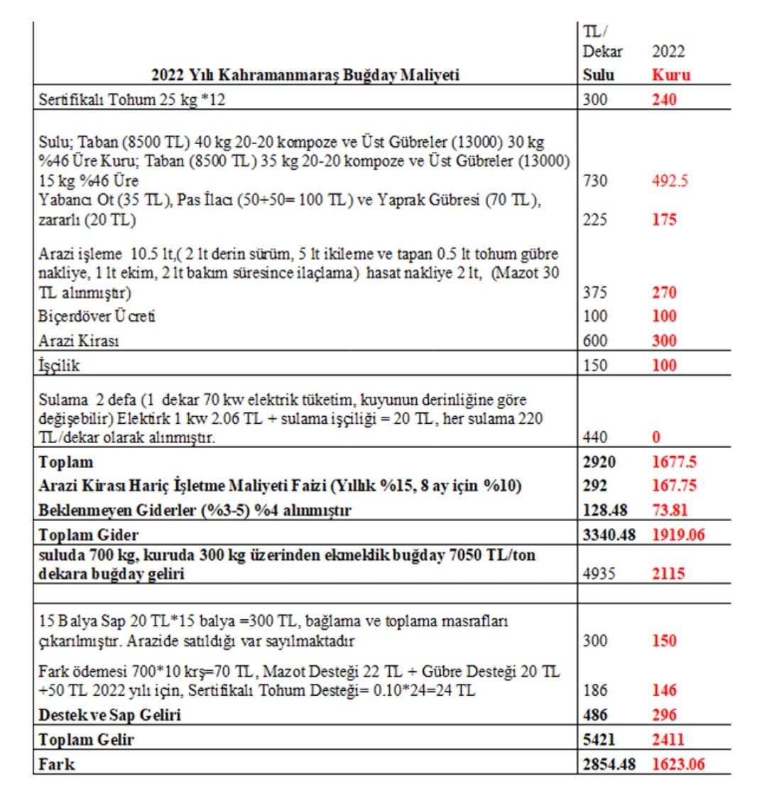 Ziraat Mühendisleri Odası (ZMO) Kahramanmaraş Şubesi 2022 yılı için Kahramanmaraş’ta buğday üretim maliyetini açıkladı.